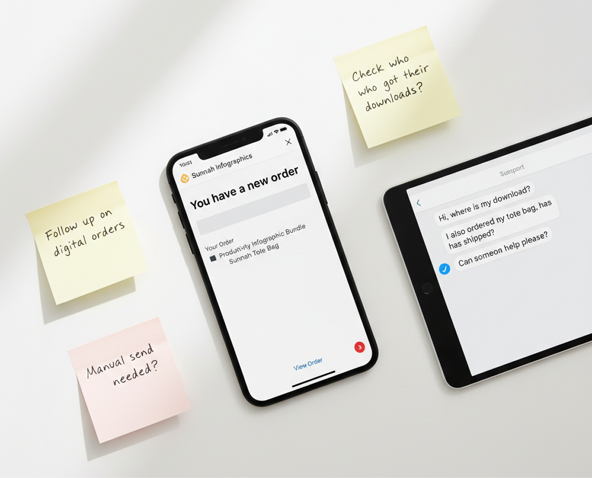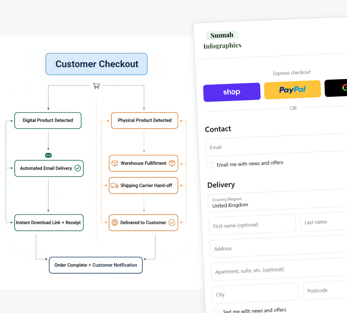 Sunnah Infographics operates a hybrid model—selling both digital downloads and physical products through a single shopfront. While this created more opportunities for growth, it also introduced friction in the customer journey. Customers purchasing digital products expected instant access. At the same time, physical products required shipping, processing, and delivery timelines. Managing both within one checkout created confusion after purchase, with customers unsure when or how they would receive their items. This led to: